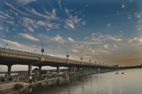河北正定子龍大橋橫跨滹沱河是目前石家莊修建的最長、最寬的一座大橋,它特點鮮明、個性突出,整個大橋的橋墩采用的是花瓶的造型,而且在裕華路改造中曾廣泛使用的紅色花崗巖在子龍大橋的建設中也得到了充分的應用。這座大橋設計美觀大方,結構堅固,是滹沱河濕地上的一個獨特風景線。